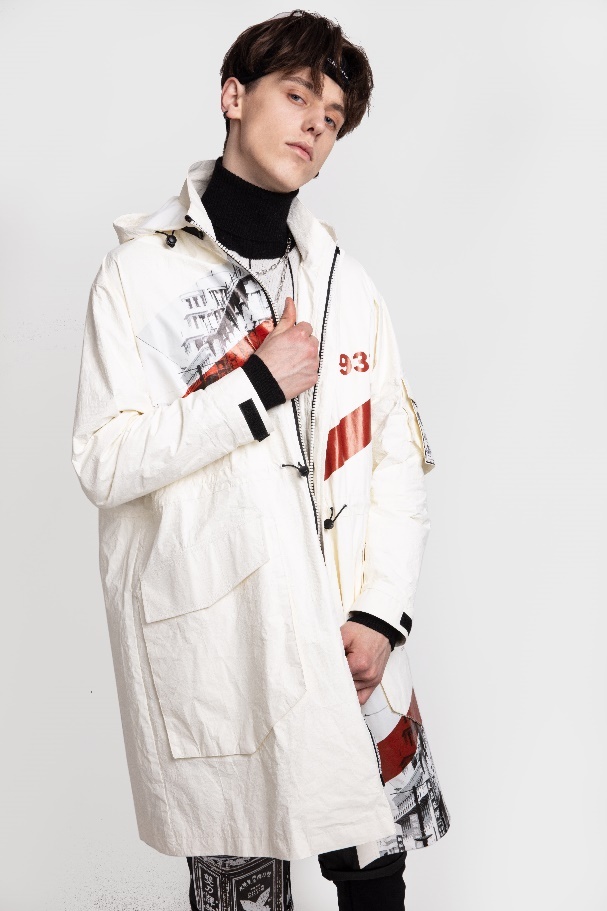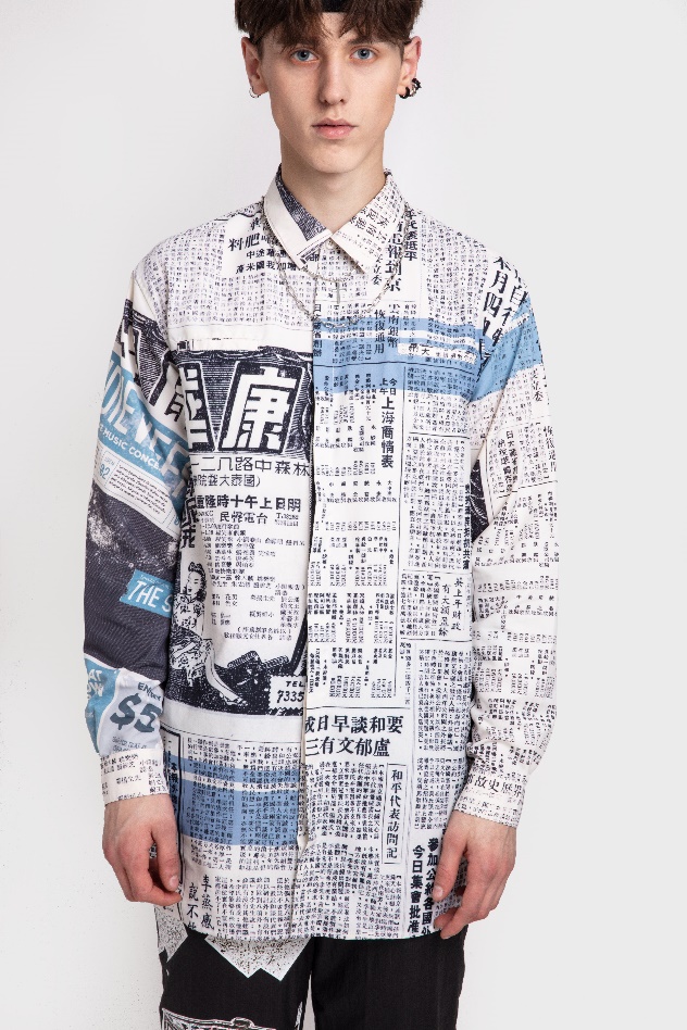 主題下分為三個系列,第一個系列是情報系列,也是特色系列。為此我專門去上圖查閱了新民晚報在建國后的期刊,搜集創(chuàng)作素材,結(jié)合over size的潮流設(shè)計了報紙素材拼貼襯衫,紙質(zhì)肌理的老上海街景燙畫輕質(zhì)風衣等。第二個系列是霓虹系列,靈感來源于百樂門,南京路的夜景,因為夜生活是古今上海最具代表性的符號之一,主要通過解構(gòu)主義印花的方式呈現(xiàn)。第三個系列是夜光系列,靈感來源于梅雨季節(jié)的路面星光,燈紅酒綠支離破碎的倒影,主要以各類熒光色條紋的重組作為圖案.